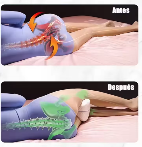 Dormir de lado sin apoyo adecuado puede causar dolor en la espalda baja, caderas y rodillas. Esta almohada coloca tus piernas y columna en una posición natural, equilibrada y libre de presión.